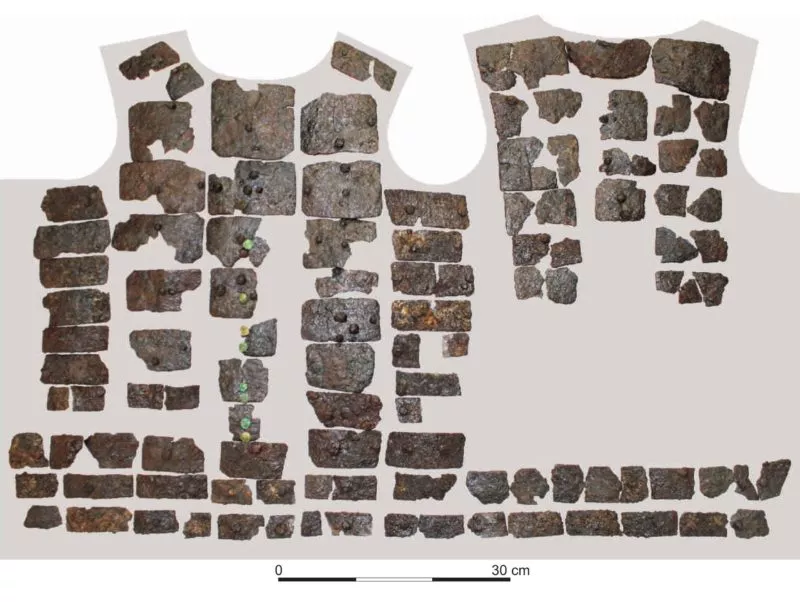 Во время раскопок внутри цистерны ученые нашли более 1 тыс. железных пластин от доспехов типа «бригандина», которые принадлежали воинам гарнизона. На некоторых из них сохранились следы ткани. Более 8 тыс. других, сильно фрагментированных, железных пластин условно отнесли к обломкам ламинарного доспеха. Часть находок — это пластины, которые могли применять не только на панцирном покрытии, но и служить для крепления на широком защитном поясе. Кроме того, в цистерне сохранились железные и медные заклепки, а также пряжки, которые использовали для соединения ремешков доспеха «бригандина» и портупей.