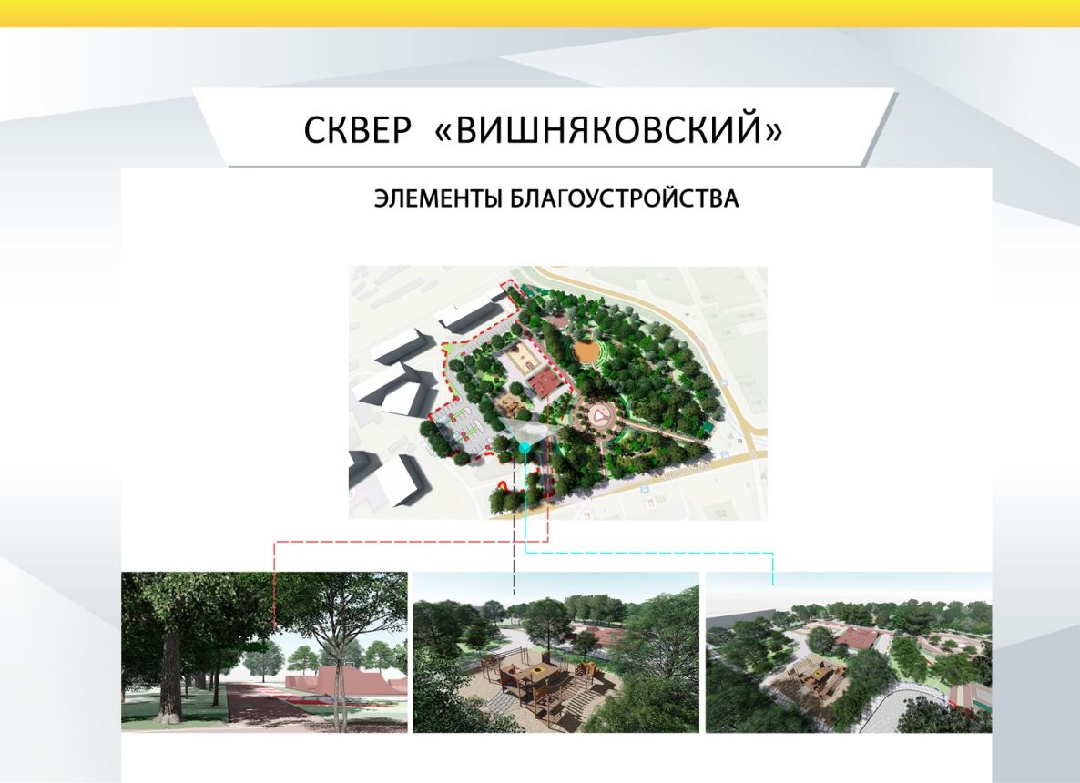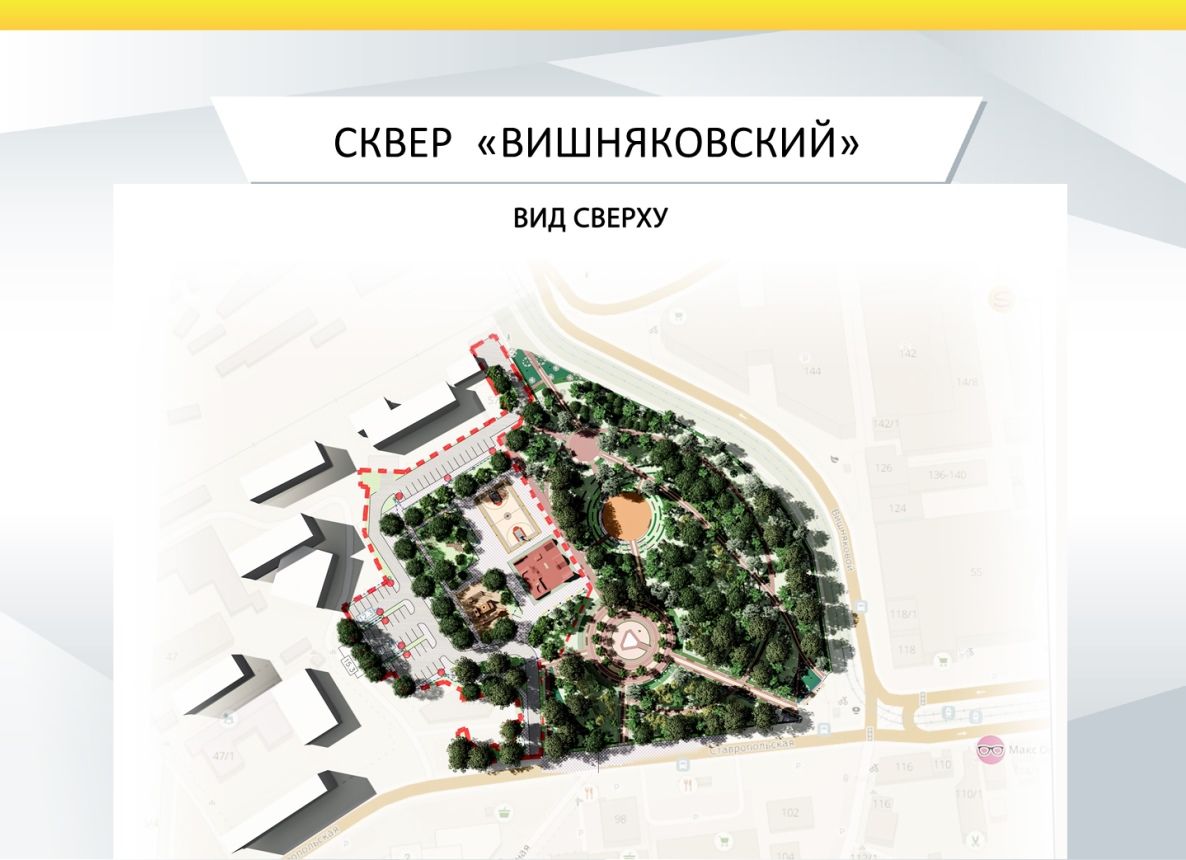 Первую очередь сквера на Вишняковой реконструировали в 2017 году. На территории около 1,6 га создали сеть пешеходных дорожек, установили лавочки, детскую площадку и систему автоматического полива, обновили стелу. Тогда же сообщалось, что мэрия занимается вопросом передачи соседнего участка площадью 1 га в муниципальную собственность для дальнейшего расширения сквера.