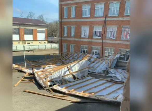 Сильный ветер днем 26 февраля сорвал кровлю школы в поселке Тамань на Кубани