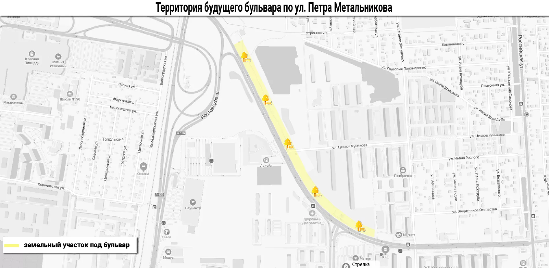 Бульвар хотят построить на территории протяженностью более 1 км вдоль дороги с правой стороны улицы Петра Метальникова — от Московской в сторону Ростовского Шоссе. Департамент муниципальной собственности и городских земель должен сформировать этот участок под новый бульвар.