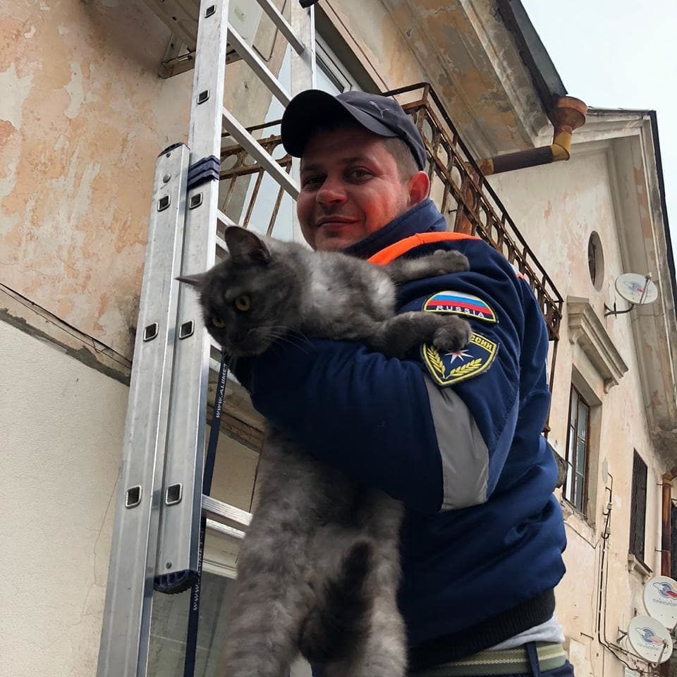 Первый кот забрался на балкон здания на улице Советов и не смог спуститься сам. Ему помогли спасатели.