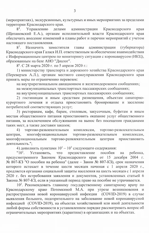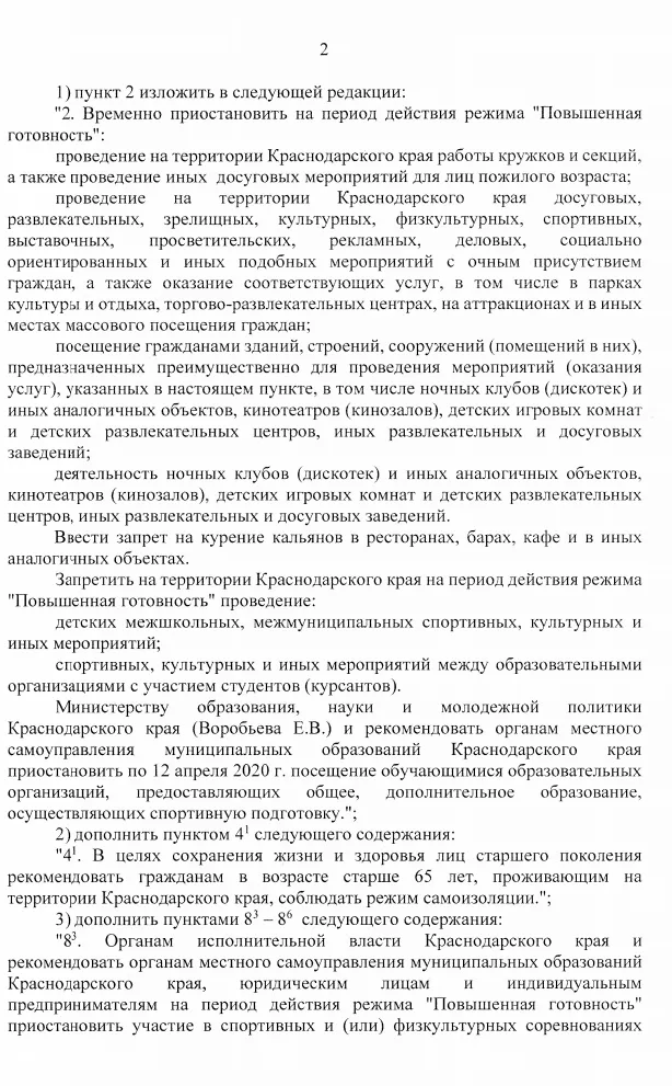 24 марта федеральный оперативный штаб по борьбе с коронавирусом рекомендовал властям регионов временно закрыть досуговые заведения и ввести запрет на курение кальянов. На следующий день главный санитарный врач Кубани подписала постановление, которым обязала с 26 марта приостановить работу заведений с массовым пребыванием людей, в том числе кинотеатров и театров, фитнес-центров, фудкортов, детских игровых центров и т.п.