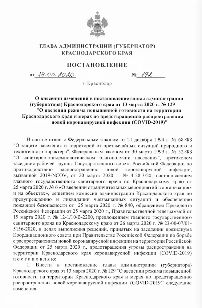 26 марта губернатор Вениамин Кондратьев подписал постановление, которым добавил ряд пунктов к документу о введении режима повышенной готовности в регионе.