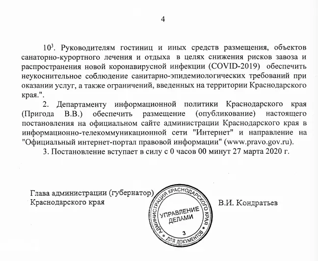 Глава Кубани поручил гостиницам не заселять гостей и приостановить бронирование, торговым центрам закрыться, а общепиту работать только навынос