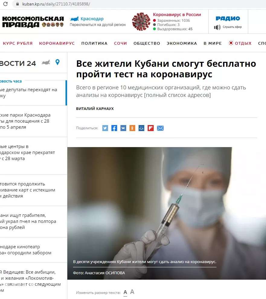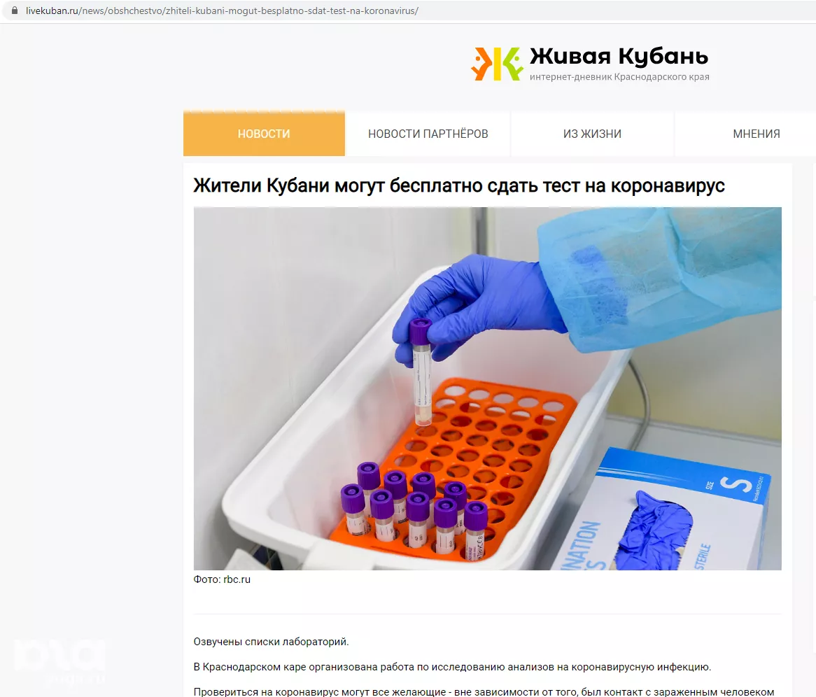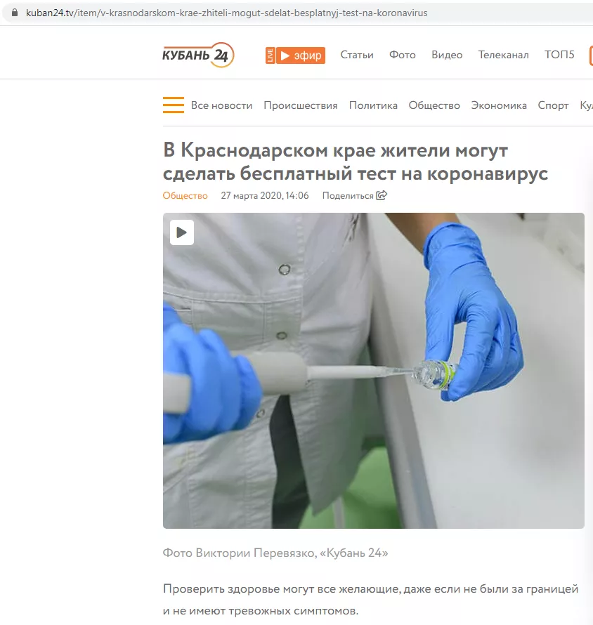 27 марта в анонимных телеграм-каналах и на сайтах краевых СМИ опубликовали новость о том, что все желающие могут бесплатно сдать тест на коронавирус со списком 10 медицинских учреждений. Одни журналисты написали, что следут обратиться в поликлиники, другие — что напрямую в медицинские организации. Портал Юга.ру решил разобраться в ситуации.