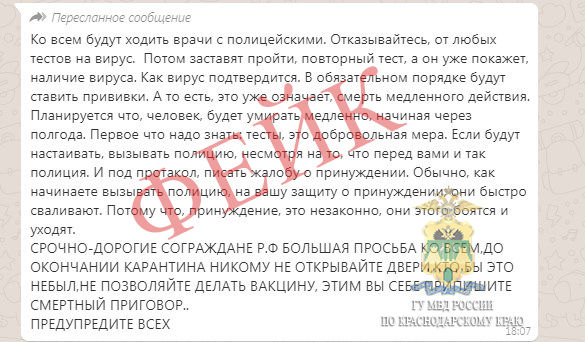 «Данная информация является недостоверной. Подворового и поквартирного обхода в целях проведения обследования населения, тестов и прививок от вирусной инфекции сотрудники Роспотребнадзора по Краснодарскому краю, полиции или медицинских служб не проводят», — заявили в пресс-службе ГУ МВД по Краснодарскому краю.