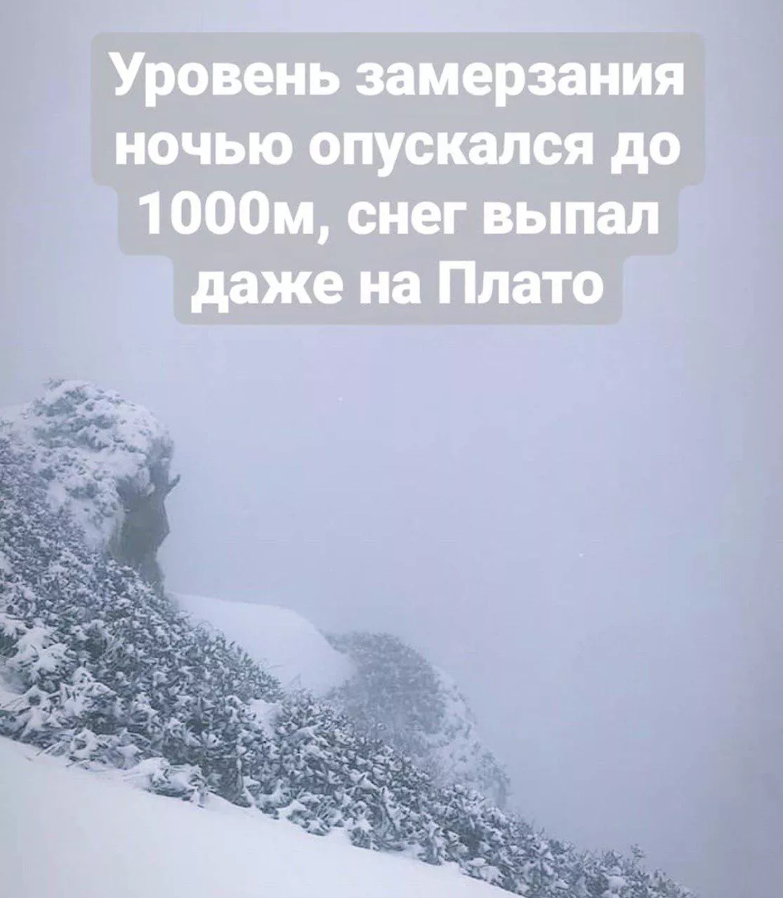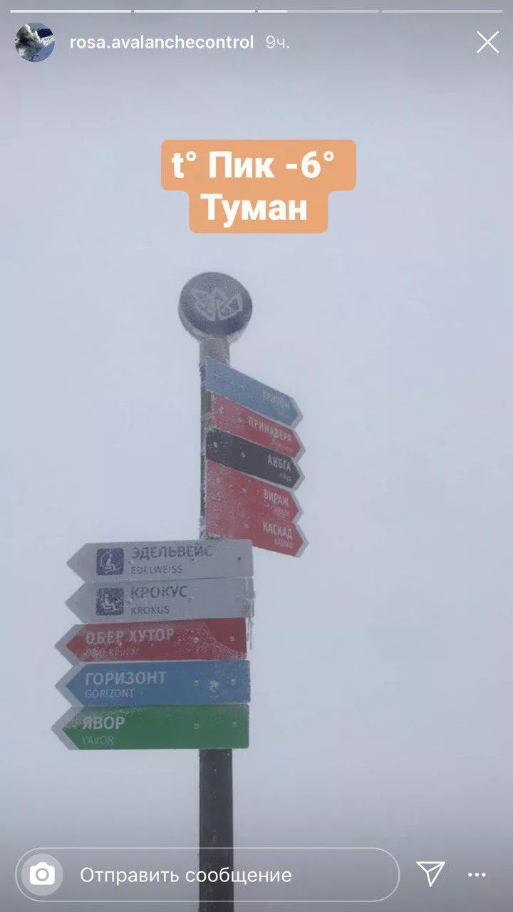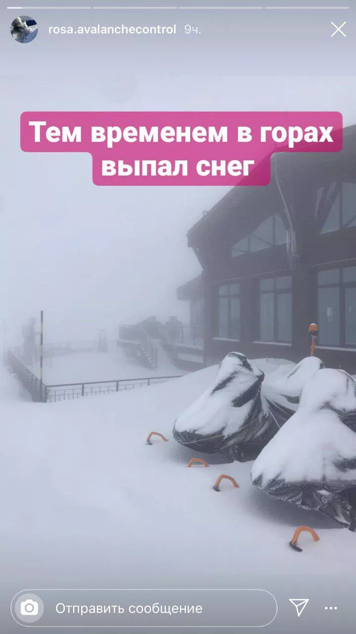 «За ночь на Пике накопилось 9 см свежего снега. На Пике -6 °С, туман», — сообщалось в инстаграме противолавинной службы курорта «Роза Хутор».