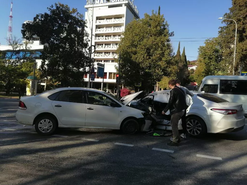 Авария произошла на перекрестке Курортного проспекта и улицы Театральной в 16:10. Как сообщил 13 апреля порталу Юга.ру старший инспектор отделения по пропаганде безопасности дорожного движения ОГИБДД УВД по Сочи Евгений Кривоконев, водитель Volkswagen Polo проехал на красный свет и врезался в Toyota Camry. Последняя иномарка в тот момент выезжала на Курортный проспект с улицы Соколова.