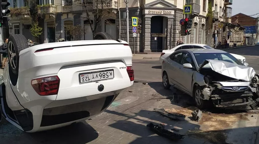 В Краснодаре на улице Красной днем 14 апреля столкнулись две машины, от удара одна из них перевернулась