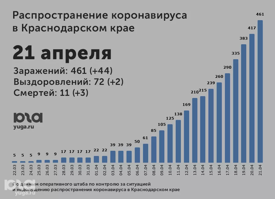 В краевой столице подтвердили 20 новых случаев заражения, в том числе у четырехмесячного ребенка. Шесть человек заболели в Ейске, среди них семилетний ребенок. Еще четыре случая подтвердили в Сочи, по три — в Выселковском и Щербиновском районах, два — в Тихорецком, по одному — в Калининском, Красноармейском, Кущевском, Староминском, Кореновском и Тимашевском районах. Всего на Кубани 461 пациент с COVID-19.