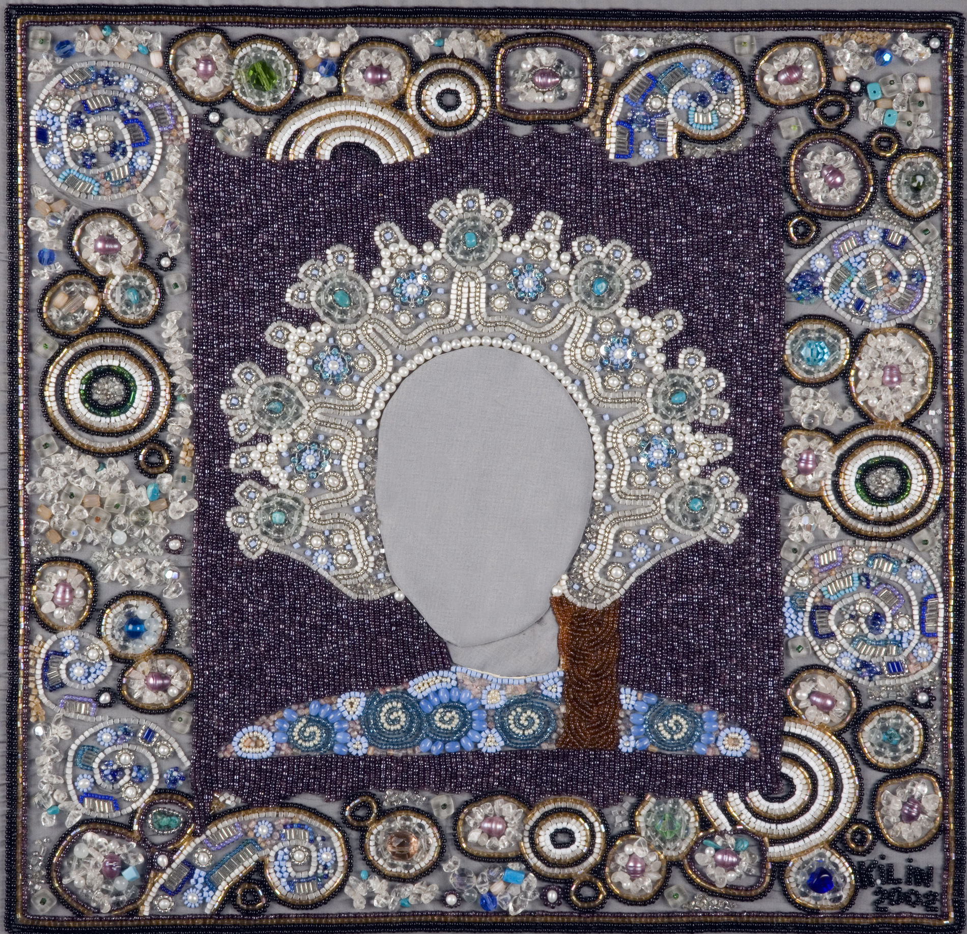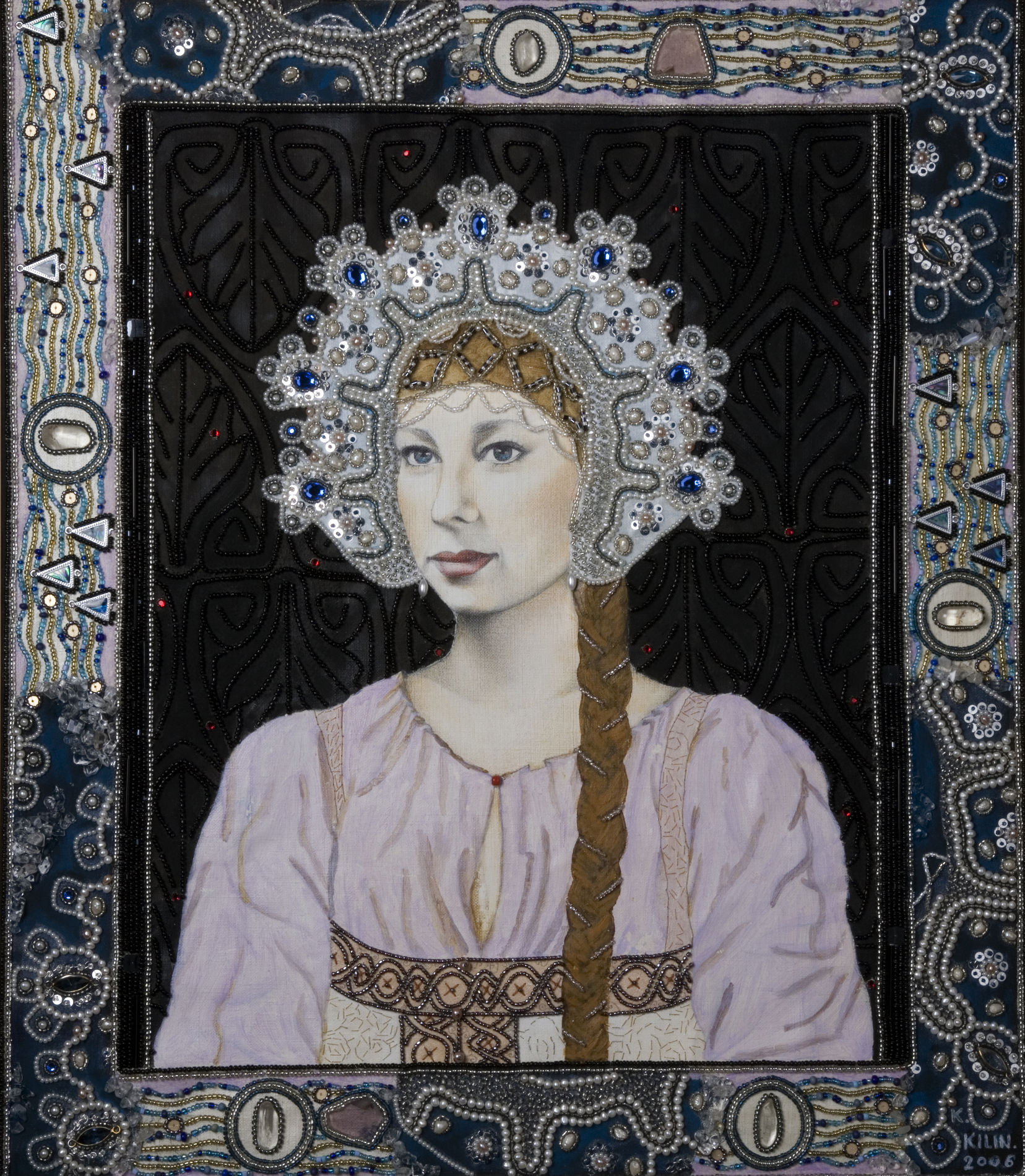 Мужчина делает портреты, украшенные дорогими камнями, сусальным золотом, жемчугом, хрусталем Сваровского, янтарем. Художник использует также парчу, бархат, бисер, шелк. Изображения получаются рельефными, на них играют свет и тень.