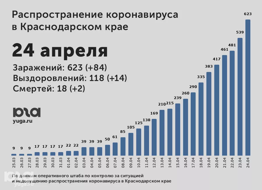 Оперштаб Краснодарского края 24 апреля сообщил о том, что число зараженных COVID-19 за день выросло на 84