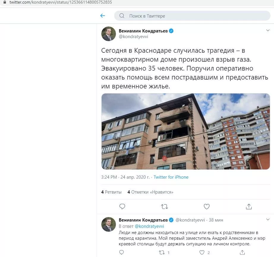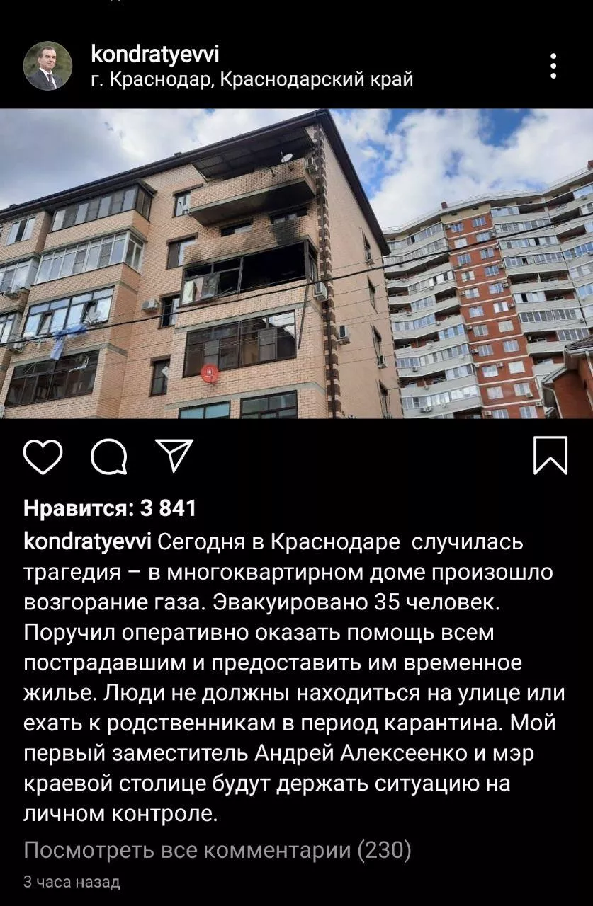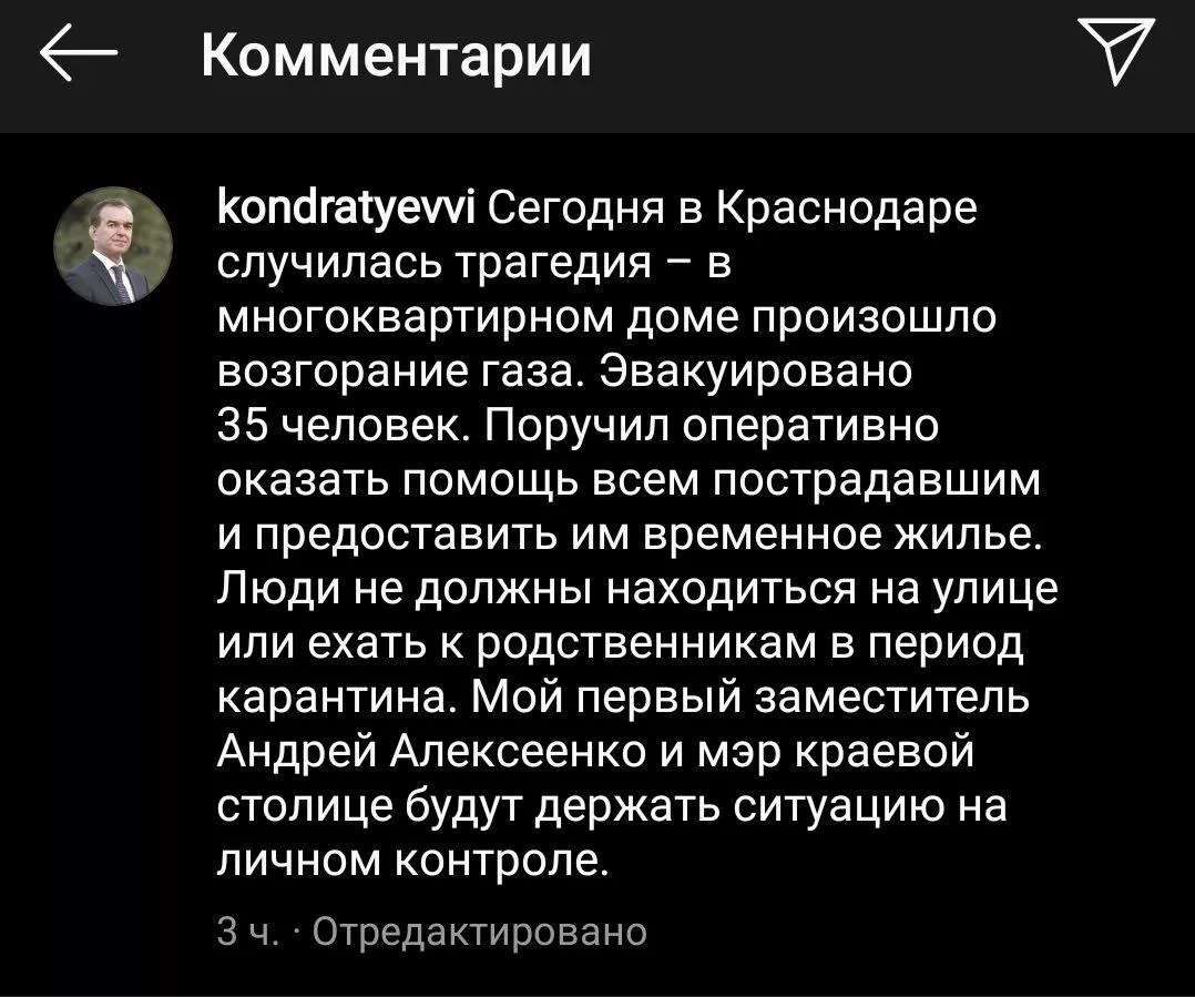 О происшествии в своих соцсетях написал губернатор Краснодарского края Вениамин Кондратьев. Случившееся он назвал взрывом газа. Однако спустя полчаса он исправил текст в своем инстаграме и уточнил, что в переулке Ленинском произошло «возгорание газа».