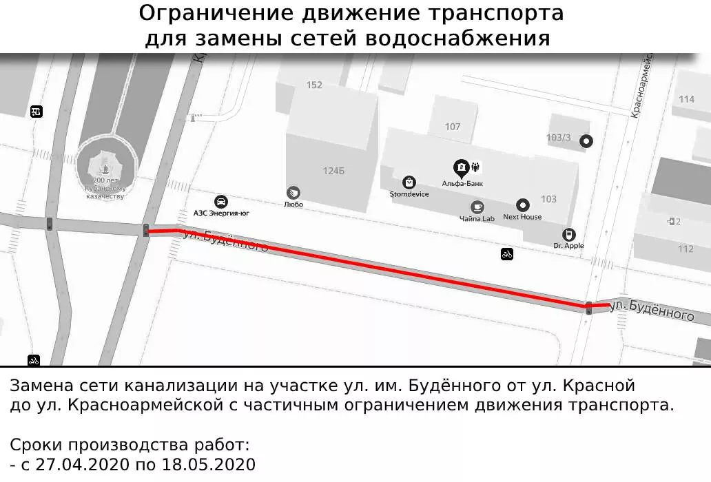 В Краснодаре 27 апреля начнут ремонтировать сети водоснабжения на улице Буденного и на время работ ограничат движение транспорта