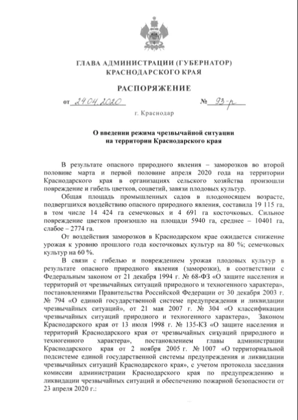 Из-за гибели и повреждения урожая власти края ввели режим чрезвычайной ситуации в некоторых районах. Распоряжение главы региона Вениамина Кондратьева № 93-р появилось на сайте администрации накануне, однако документ подписан и вступил в силу 24 апреля. В тексте говорится, что цветки, соцветия и завязи плодовых культур погибли или пострадали в результате заморозков во второй половине марта и первой половине апреля 2020 года.