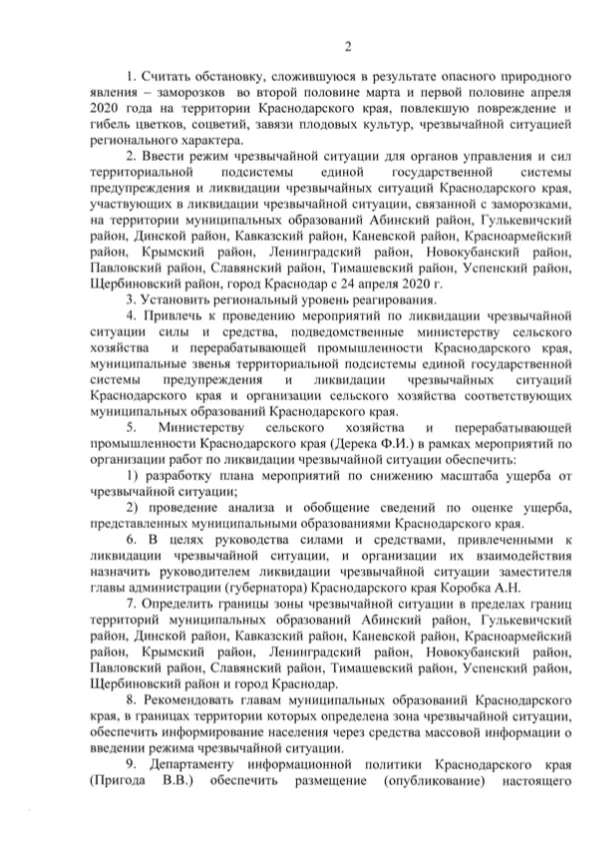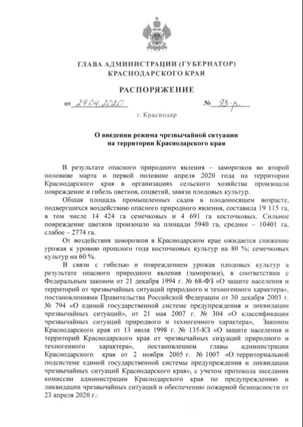«От воздействия заморозков в Краснодарском крае ожидается снижение урожая к уровню прошлого года косточковых культур — на 80%; семечковых культур — на 60%. Ввести режим чрезвычайной ситуации», — сказано в документе.