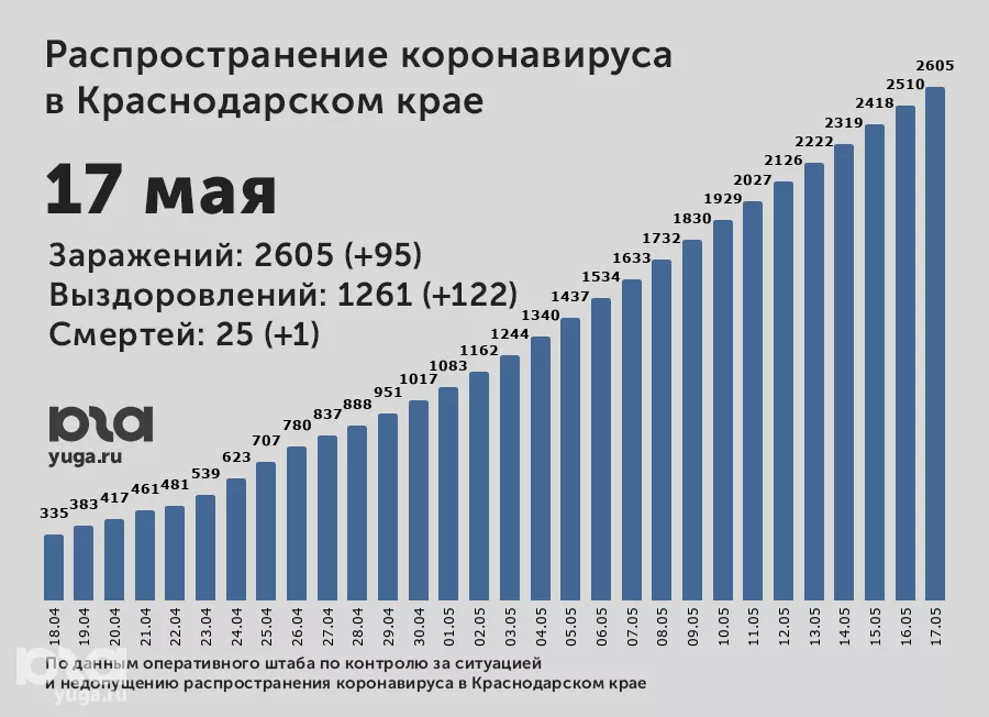 В Краснодарском крае 17 мая коронавирус диагностировали у 95 человек, один больной скончался