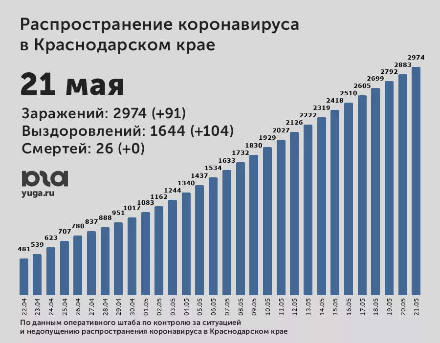 В Краснодарском крае к 21 мая зарегистрировали 91 новый случай заражения COVID-19
