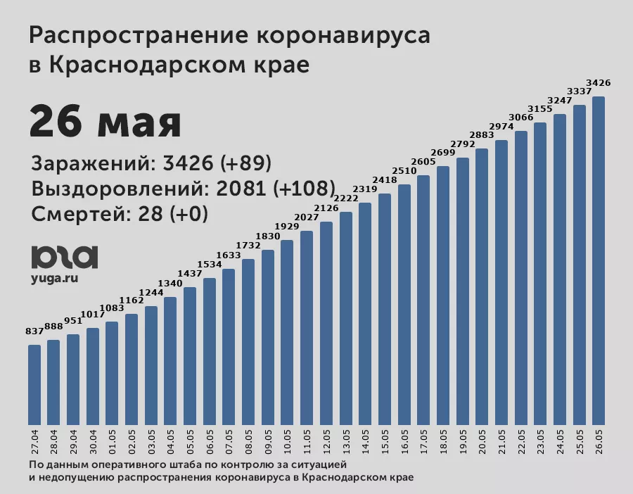 В Краснодарском крае с 25 по 26 мая зарегистрировали 89 человек с COVID-19, зараженным от 11 месяцев до 92 лет. 108 человек выписали из больниц, новых летальных исходов не было.