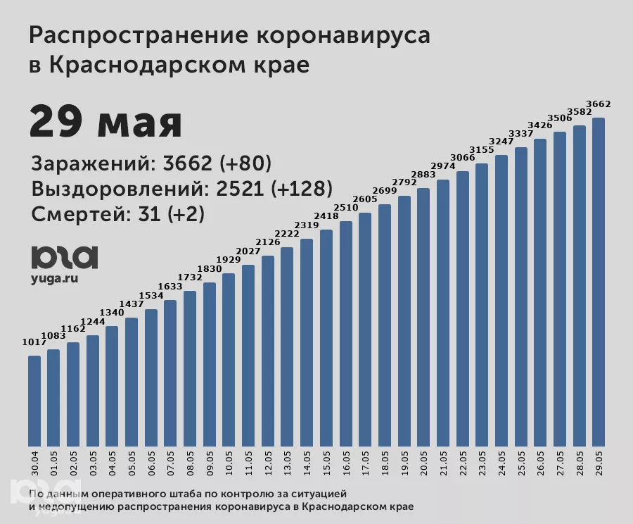 В Краснодарском крае к 29 мая коронавирусом заболели 3 тыс. 662 человека