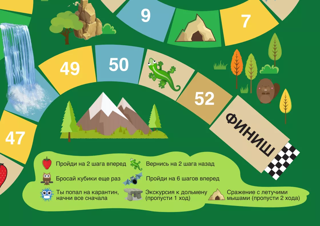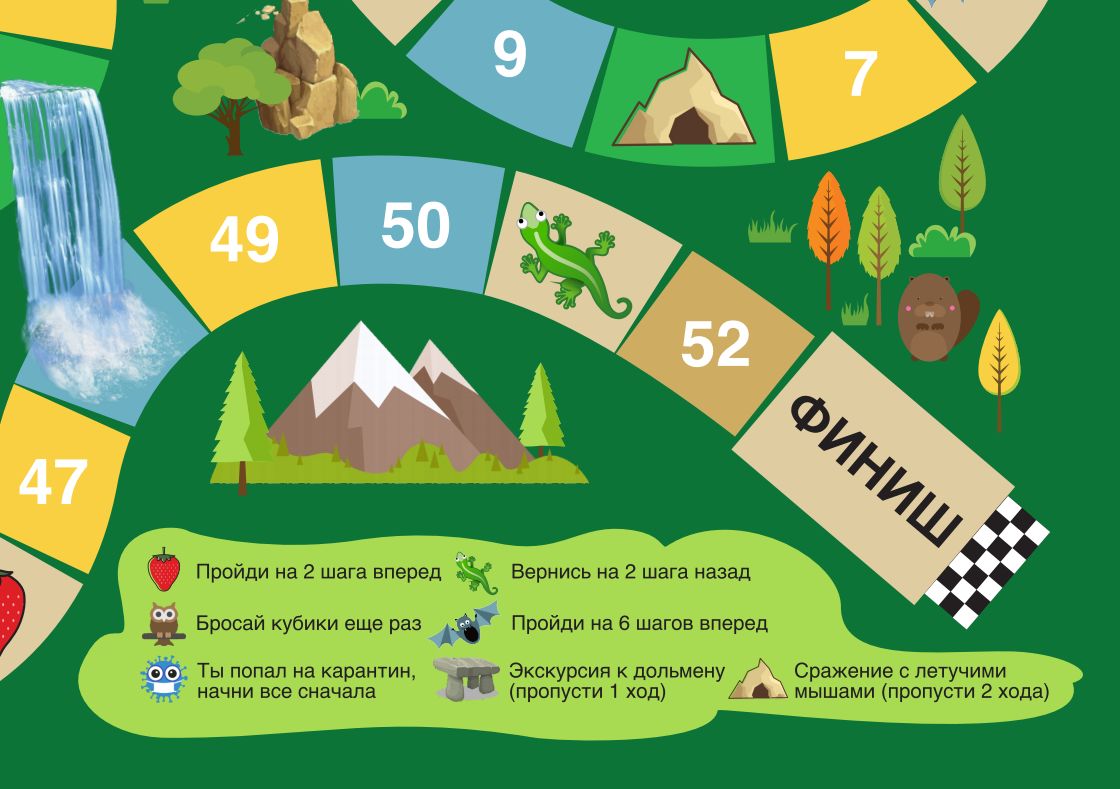 Для того чтобы сыграть в квест-игру «Бродилка по Нацпарку», достаточно ее скачать по ссылке либо сохранить с сайта Юга.ру. Картинки нужно будет распечатать на четырех листах формата А4 и склеить. Также игрокам понадобятся кубик и фишки.