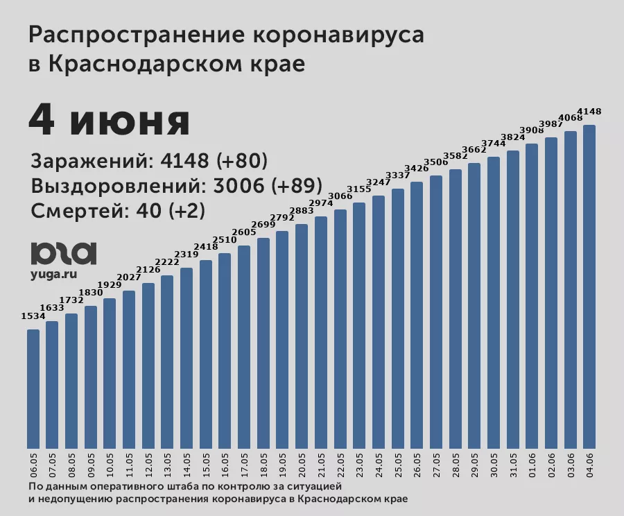 В Краснодарском крае к 4 июня зарегистрировали 4 тыс. 148 случаев инфицирования коронавирусом