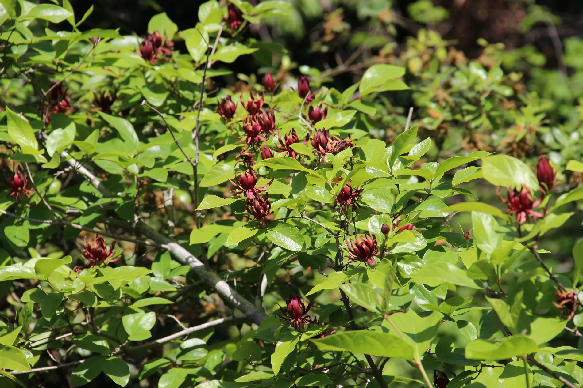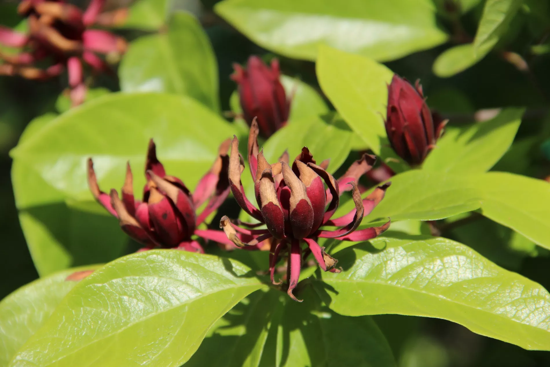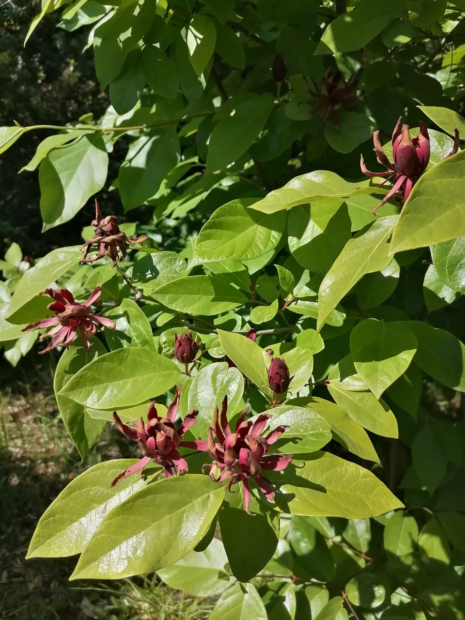 Винное дерево, каликант цветущий, образует кувшинообразные плоды величиной до 7 см. Его листья, цветки и кора издают приятный аромат, отдающий вином.