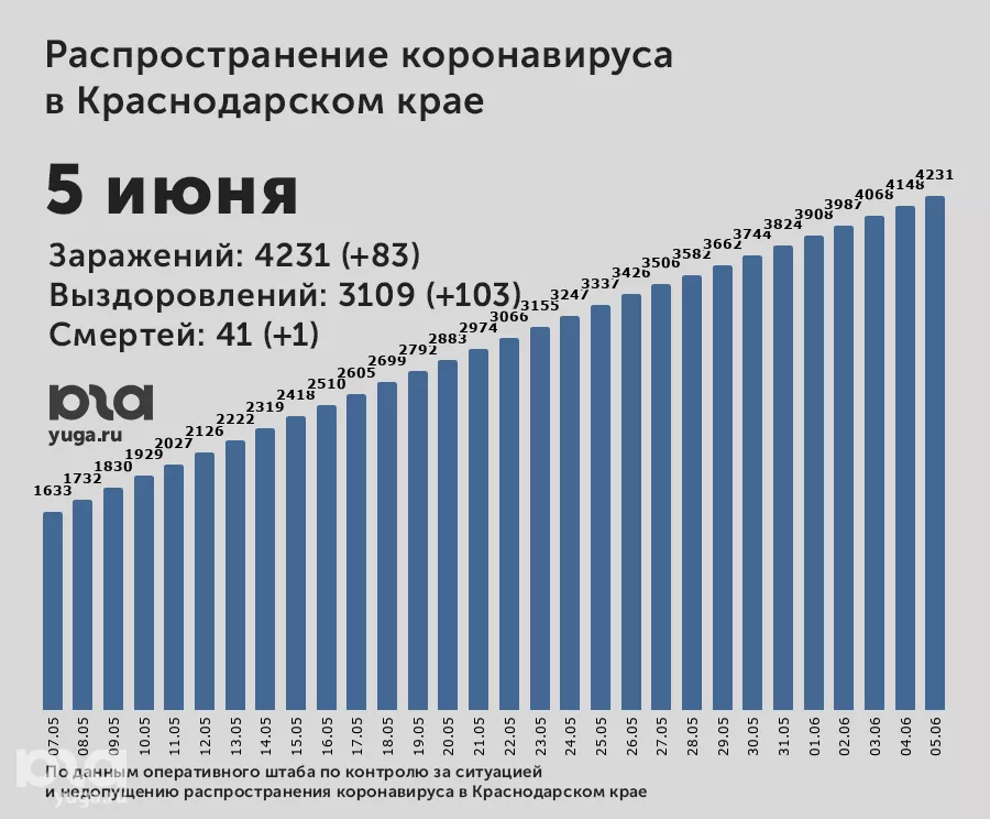 В Краснодарском крае к 5 июня количество выявленных случаев COVID-19 увеличилось до 4 тыс. 231