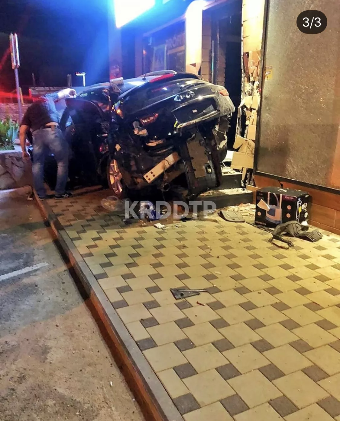 Авария случилась около 00:40. По предварительным данным, водитель автомобиля Infinity ехал по улице Буденного, не справился с управлением, съехал с дороги и врезался в здание, в котором расположен магазин.