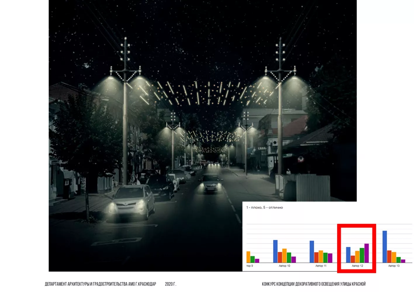 В середине марта главный архитектор Краснодара Наталья Машталир объявила конкурс на лучший дизайн для новой иллюминации на Красной. В начале июня в сети опубликовали конкурсные проекты, жители могли проголосовать за работы понравившихся авторов.
