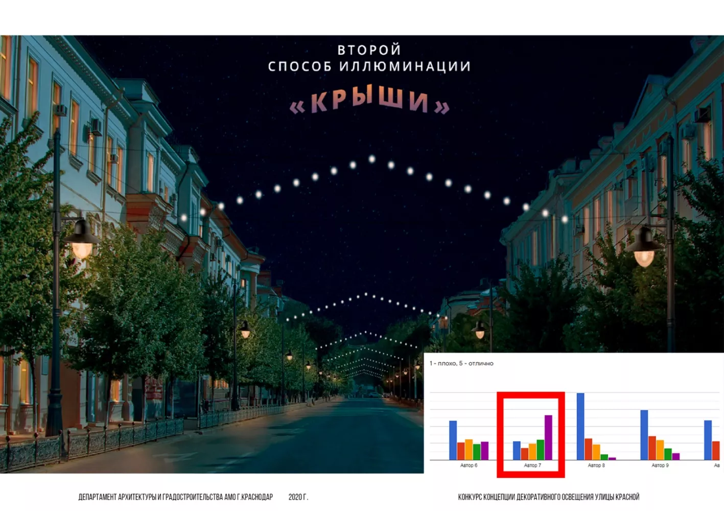 Главный архитектор Краснодара Наталья Машталир 8 июня рассказала, какие конкурсные работы по иллюминации улицы Красной лидируют в голосовании