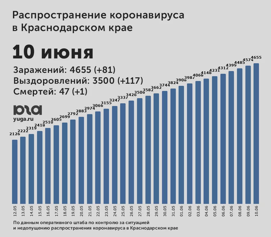 В Краснодарском крае к 10 июня количество инфицированных COVID-19 достигло 4 тыс. 655 человек