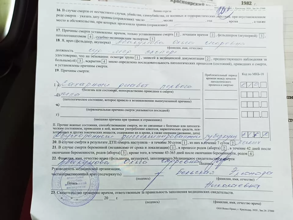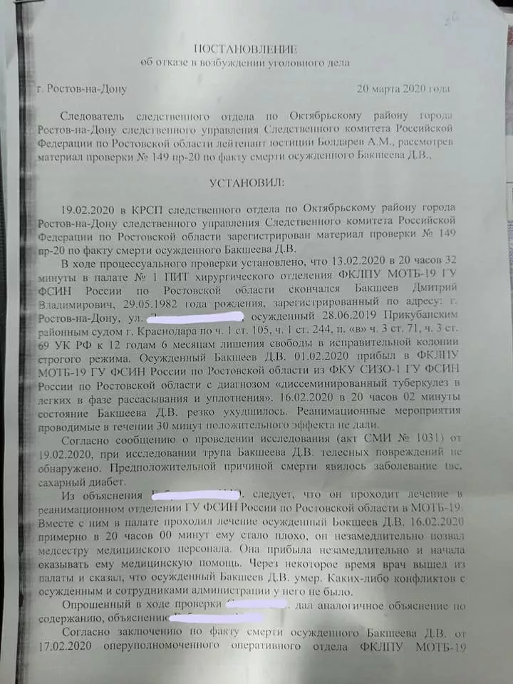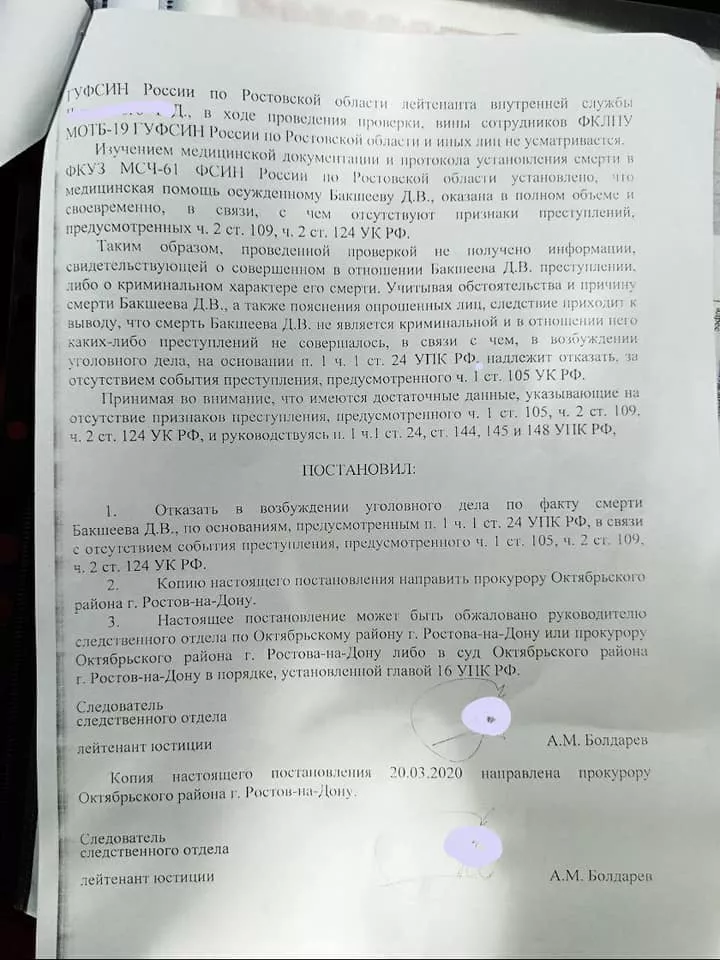 Федотова также опубликовала постановление, подписанное следователем следственного отдела по Октябрьскому району Ростова-на-Дону, об отказе в возбуждении уголовного дела по факту смерти Бакшеева.