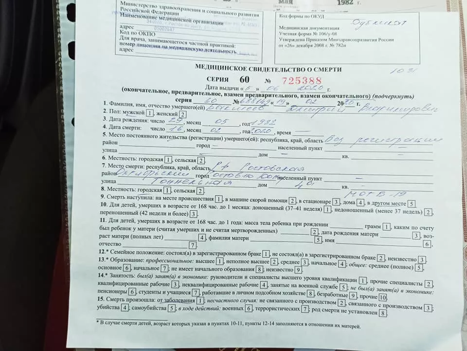 Адвокат Алексей Аванесян рассказал порталу Юга.ру, что медицинскую справку о смерти Бакшеева, которая была подписана 5 числа, правозащитники получили только 10 июня.