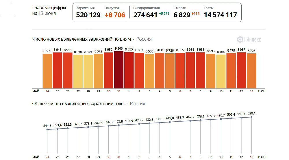 Заразившиеся выявлены в 84 регионах страны. Причем, 2 970 случаев инфекции протекает без клинических проявлений. Это от общего числа составляет примерно 34,1%, уточнил RT. Также зафиксировано 114 летальных случаев. С начала наблюдений за развитием пандемии в России выявлено 520 129 случаев заражения коронавирусом во всех регионах. Скончалось 6 829 человек.