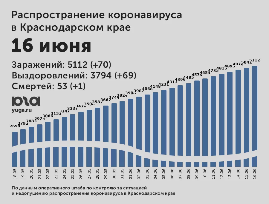 В Краснодарском крае к утру 16 июня количество зараженных увеличилось на 70 человек. За сутки выздоровели 69 человек, зарегистрирован один умерший.
