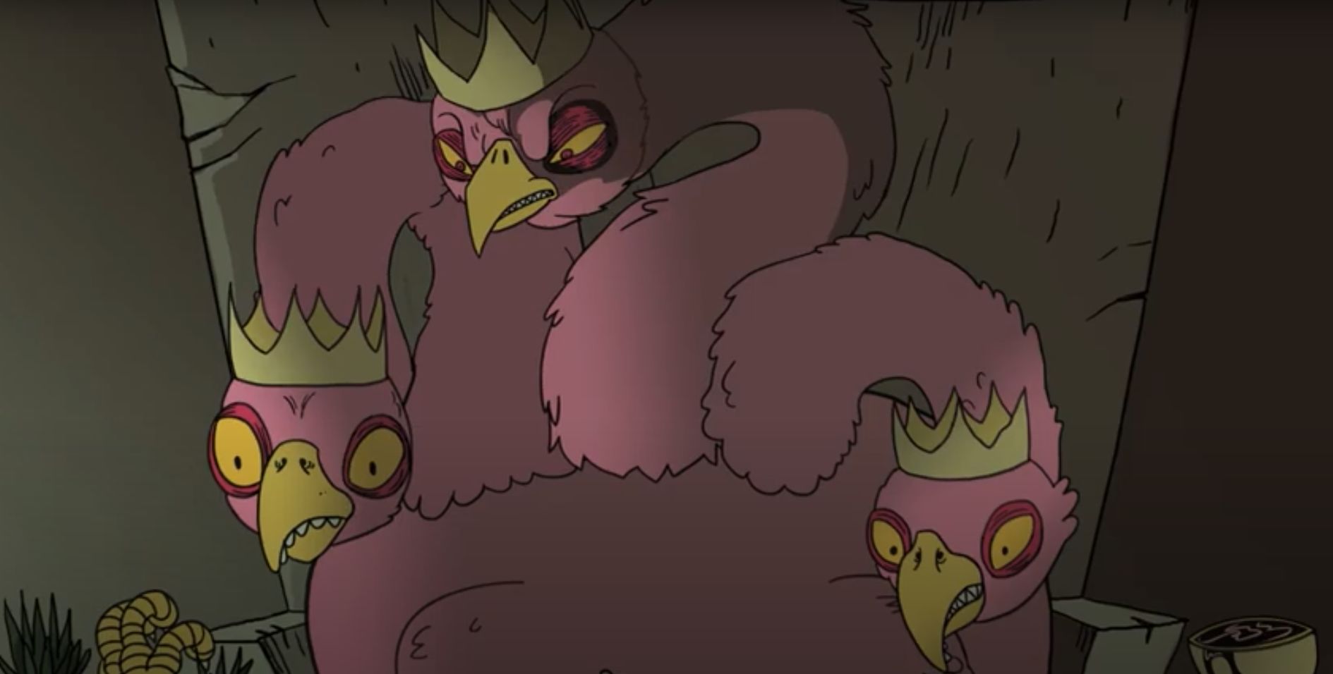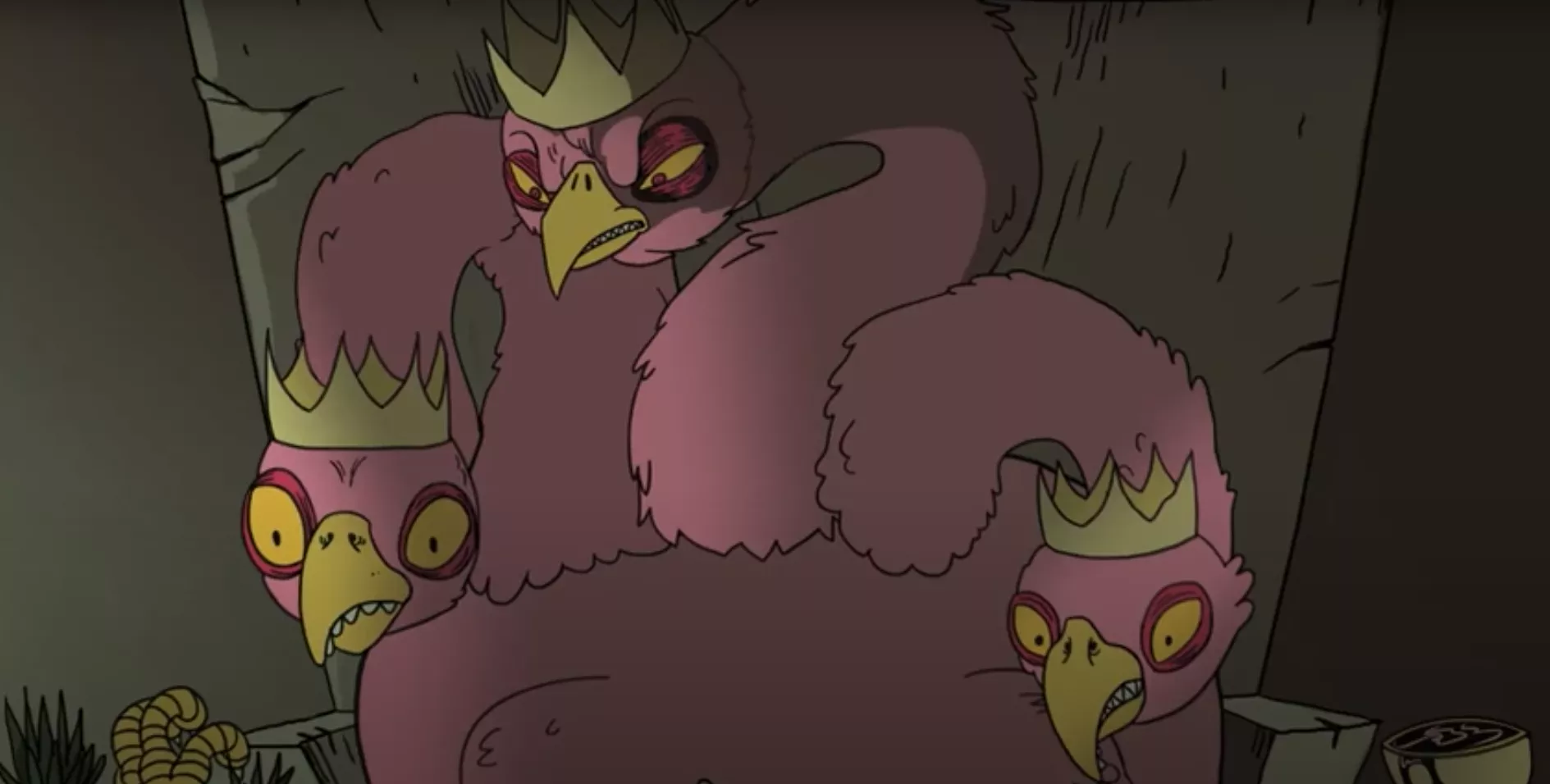 Птица с удивлением смотрит на короля, а потом хватает на полу камень и разбивает им окно. В него влетают другие птицы, после чего зрителям показывают кадр с упавшей на пол короной.