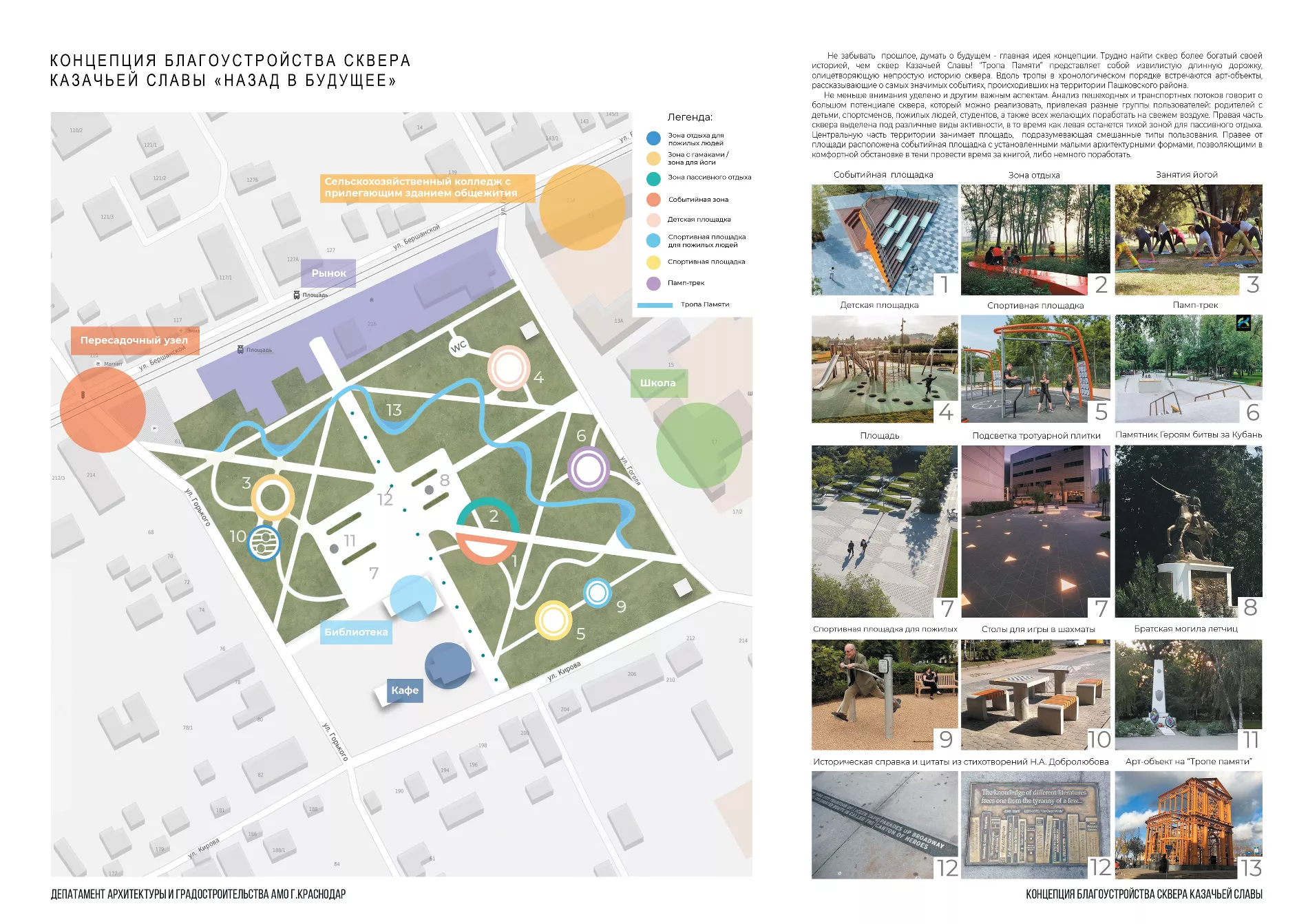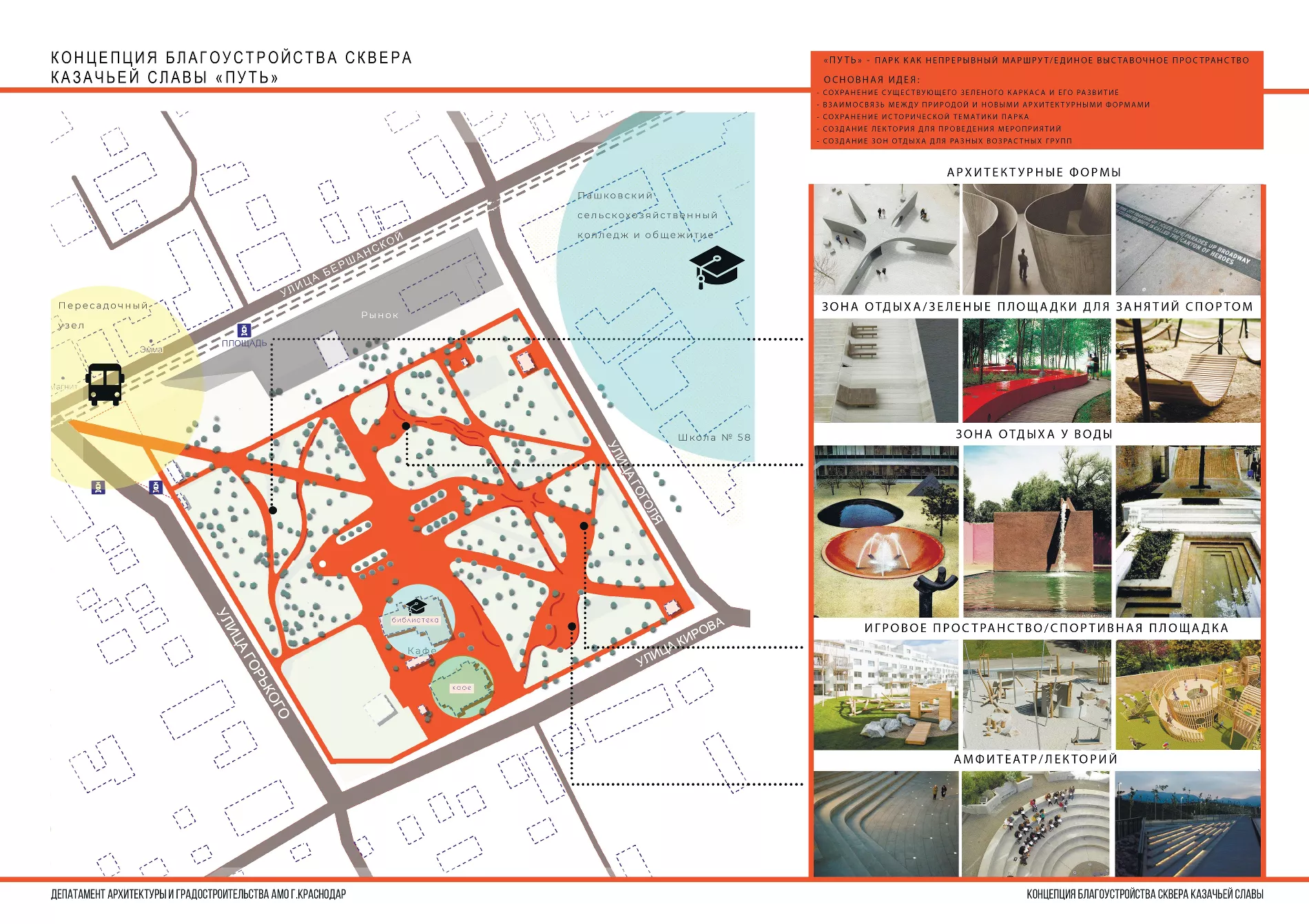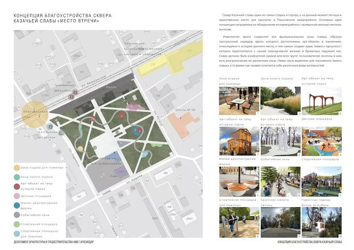 Основной идеей является историческая ретроспектива Пашковского жилого массива, которая объединила казачий быт и современную жизнь. Все функциональные зоны будет соединять одна тропа, вдоль которой расположат арт-объекты и памятники. В левой части парка располодится зона для пассивного отдыха, в правой — для активного.