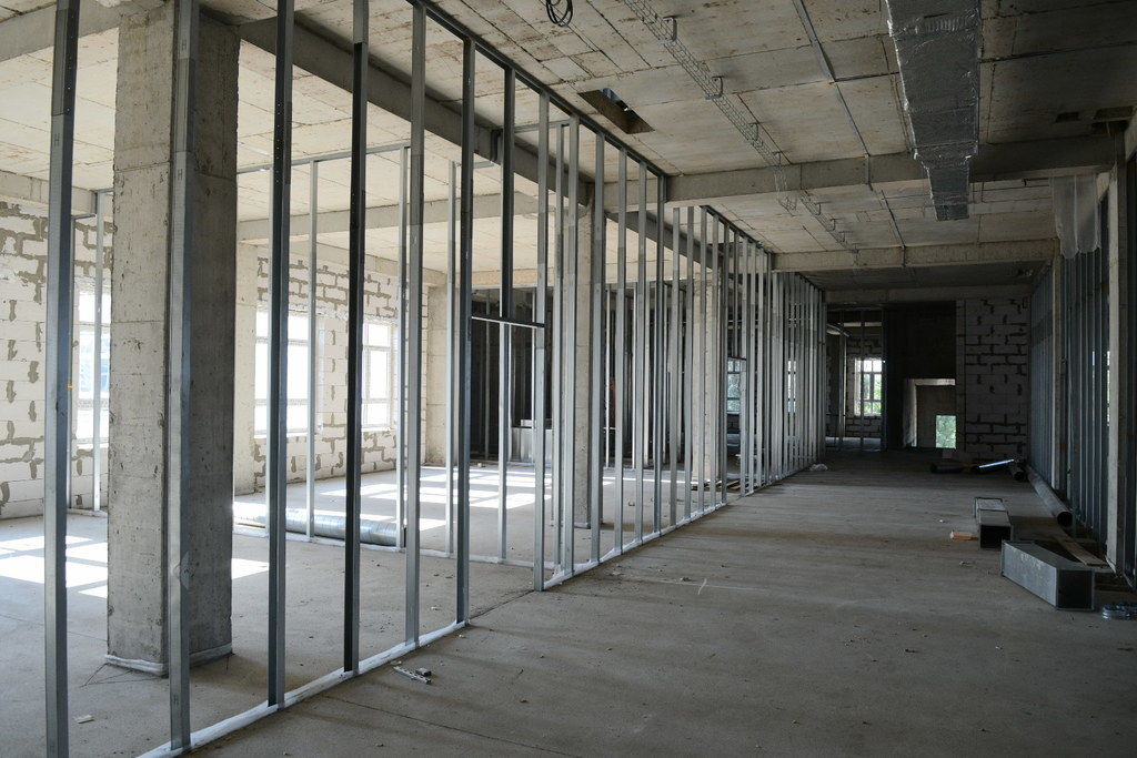Сейчас идет прокладка инженерных коммуникаций: системы отопления, водоснабжения, электричества и канализации. Специалисты делают фасад и кровлю, армируют парапеты. В одном из блоков здания начали внутреннюю отделку. Сдать школу должны в сентябре этого года.