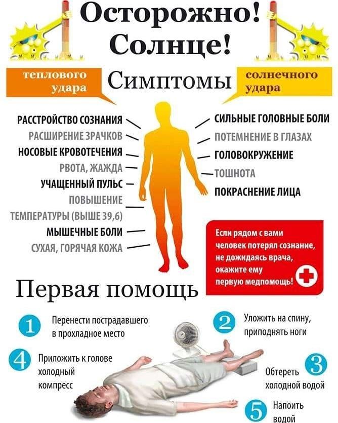 При тепловом поражении нужно немедленно перейти в тень, на ветер или принять душ. Также необходимо выпить много воды, охладить тело.