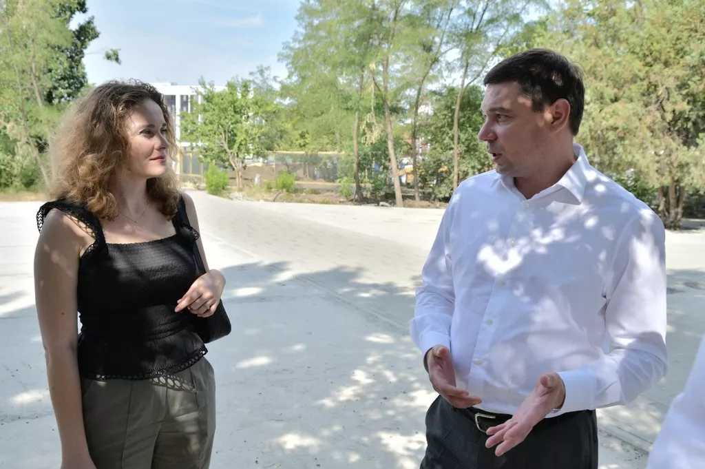 Мэр Краснодара Евгений Первышов 8 июля проверил, как идут работы по благоустройству сквера возле Дмитриевской Дамбы