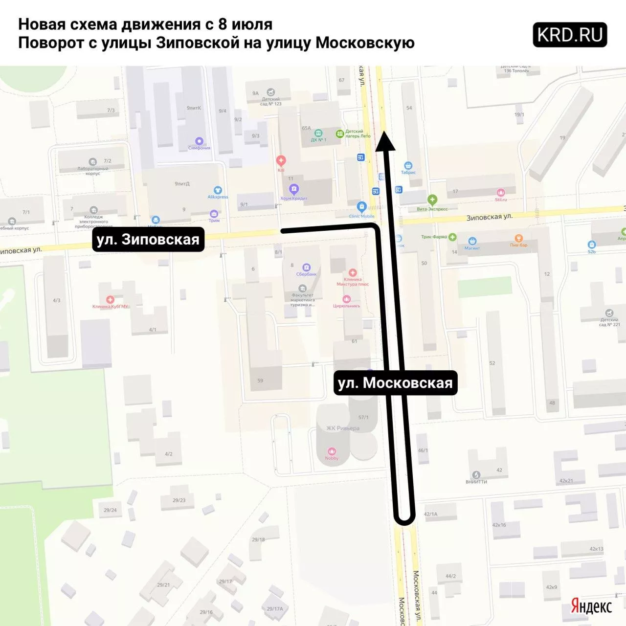 «При движении по улице Зиповской на подъезде к улице Московской поворот налево в сторону улицы Солнечной будет запрещен. Новая схема движения действует с 8 июля», — рассказали в департаменте транспорта и дорожного хозяйства города.
