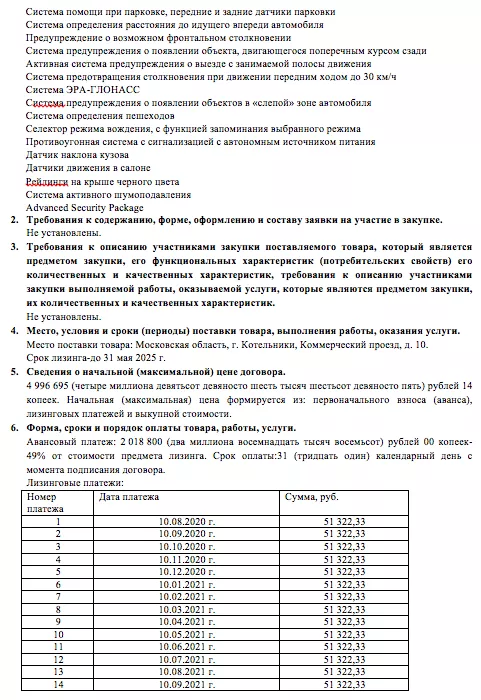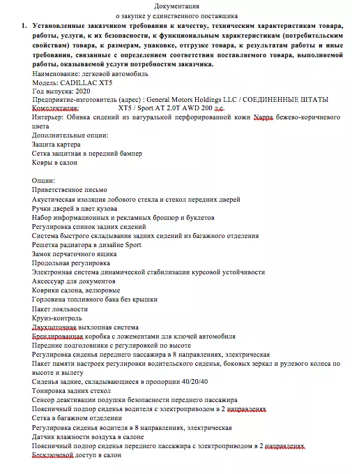 Также из документа следует, что компания хотела купить машину 2020 года выпуска в комплектации Sport AT 2.0T AWD 200 л.с. Сиденья должны быть обиты натуральной перфорированной кожей Nappa бежево-коричневого цвета. Кроме того, у автомобиля должен быть панорамный люк, пакет курильщика, беспроводная зарядка телефонов и другое.