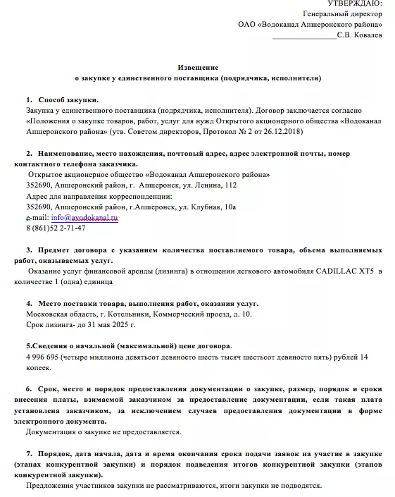Паблик «Туподар» утром 10 июля обратил внимание, что на сайте госзакупок 8 июля появилось извещение о лизинговой покупке автомобиля Cadillac XT5. Заказчиком значилось ОАО «Водоканал Апшеронского района». В общих сведениях о закупке модель автомобиля была указана с ошибкой, при этом в прикрепленных документах все наименования написаны правильно.