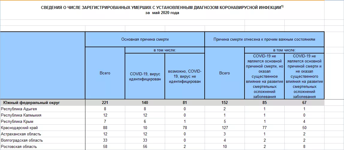 Сколько же человек умерло в Краснодарском крае? По данным краевого оперштаба, в Краснодарском крае с 1 по 31 мая 2020 года диагностировали смерть 13 человек от коронавируса (2 мая оперштаб сообщал о 20 скончавшихся пациентах, 1 июня — о 33). По данным же Росстата, на Кубани умерли 88 человек от коронавируса. Из них у десяти был подтвержден коронавирус, у 78 пока не подтвержден, но клиническая картина в высокой степени вероятности указала на наличие этой инфекции. Еще у 77 человек коронавирус не стал основной причиной, но повлиял на смертельное развитие других болезней, а у 50 скончавшихся пациентов он был установлен, но не оказал влияние на здоровье.
