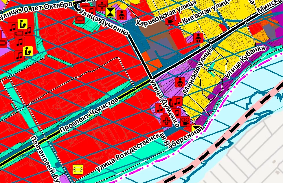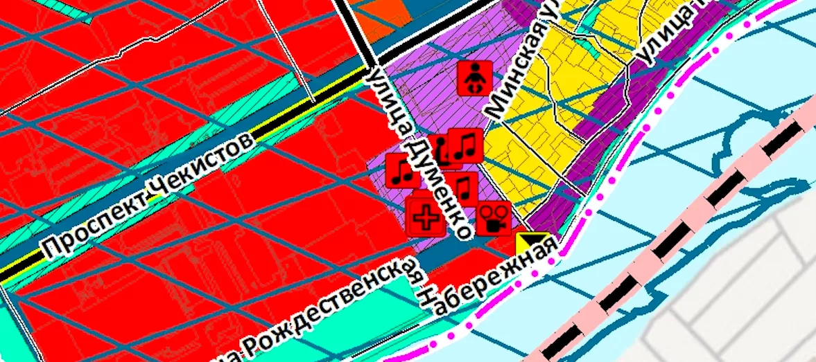 В Юбилейном микрорайоне территория под гаражными кооперативами отмечена как зона специализированной общественной застройки (сиреневый цвет). Согласно новому проекту, на пересечении улиц Думенко и Минской, где сейчас стоят гаражи, хотят построить детский сад, школу, три организации дополнительного образования, культурно-досуговый объект и поликлинику. На пересечении улиц Алма-Атинской и Думенко, где также расположен кооператив, планируют сделать детсад, поликлинику, организацию дополнительного образования и два спортивных сооружения.