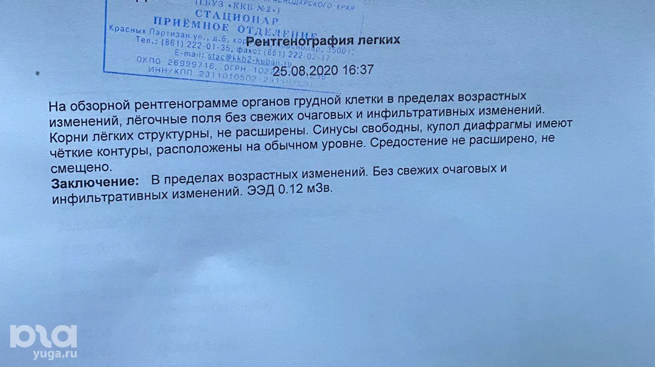 25 августа мать журналиста портала Юга.ру вызвала скорую помощь и пожаловалась на симптомы заражения COVID-19. Предварительно врач поликлиники диагностировал у 61-летней женщины острую двустороннюю пневмонию. Через несколько часов бригада скорой помощи забрала пациентку в краснодарскую краевую больницу № 2 для обследования. У женщины взяли анализ крови, сделали кардиограмму и рентген грудной клетки. Все показатели оказались в пределах нормы, а рентген пневмонию не выявил. По словам пациентки, и фельдшеры скорой, и медперсонал больницы заявили, что аппарат компьютерной томографии сгорел в конце прошлой недели.