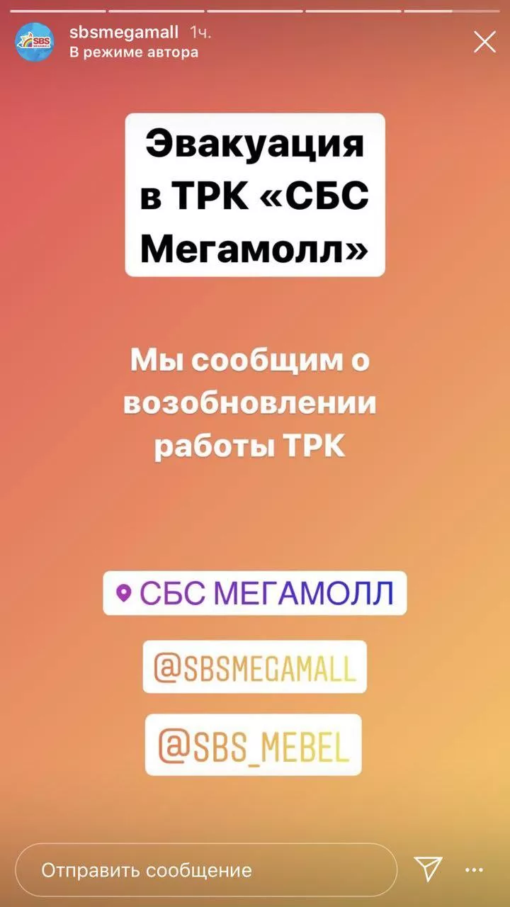 В 12:58 в инстаграме OZ МОЛЛ опубликовали пост о том, что торговый центр временно закрыт, а посетители были эвакуированы. Администрация ТЦ сообщила, что на пульт МЧС поступил сигнал об угрозе взрыва, на месте работают оперативные группы. Аналогичное сообщение об эвакуации было опубликовано и в сторис ТРК «СБС Мегамолл» в 12:37.