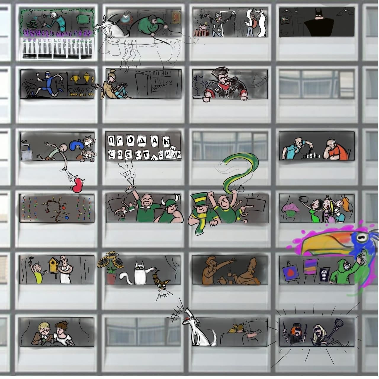 Смертин добавил, что он вместе с главным архитектором Краснодара Натальей Машталир и главредом «Краснодарских известий» Владимиром Вербицким предложили местному художнику Алексею Рыженко нарисовать молодежный баннер. Он согласился и сделал скетч с 12 окнами, в каждом из которых — сцена городской жизни.