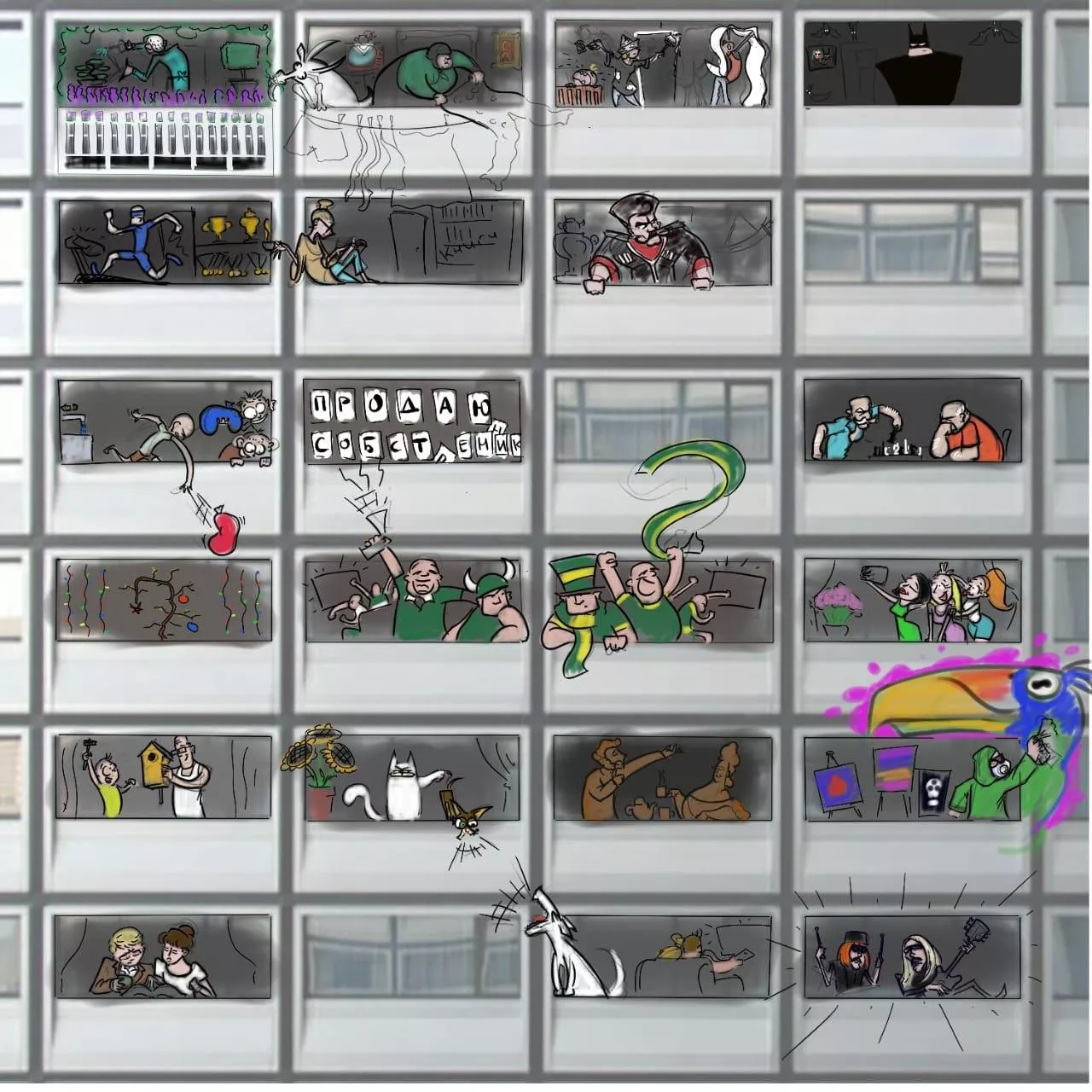 Так, на подоконнике левого верхнего окна нарисован шалфей, а внутри комнаты — дерево-бонсай, какие можно увидеть в парке «Краснодар». В других окнах можно узнать футбольных фанатов «Краснодара» и «Кубани», а также семью, которая переехала в Краснодар. На самом нижнем этаже в левом окне читают книгу девушка и парень, похожие на героев «Операции „Ы" и других приключений Шурика», а из правого окна выглядывает казак.